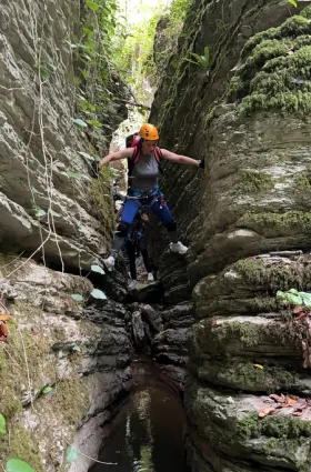 Это не классический каньонинг. Это прогулка по высохшему руслу реки Агуры — с лазаньем, верёвками и мхами всех оттенков зелёного.