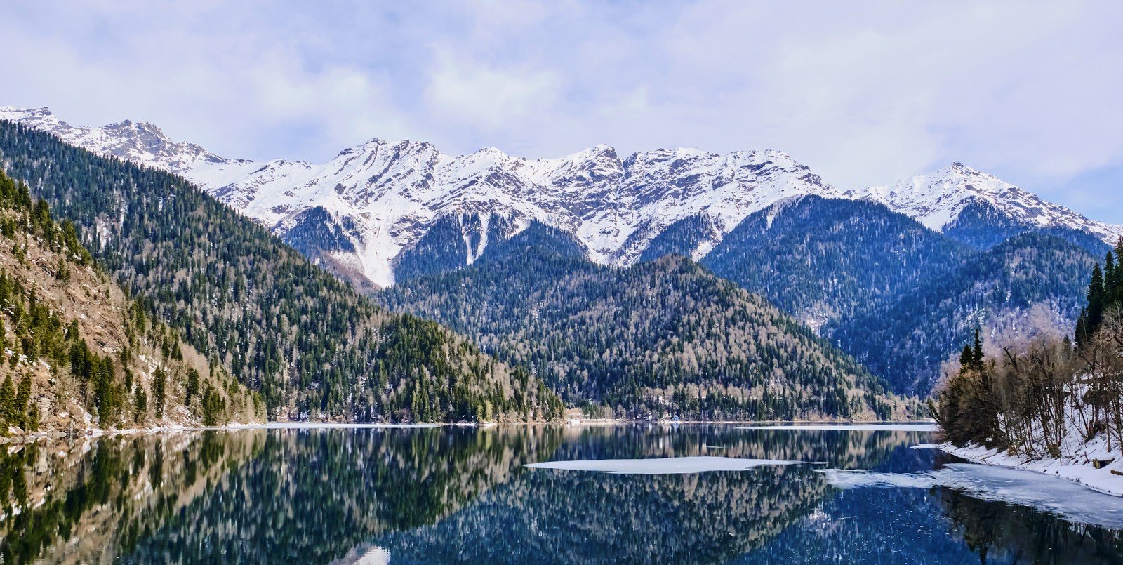 16:30 — озеро Рица в окружении густого леса