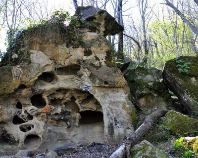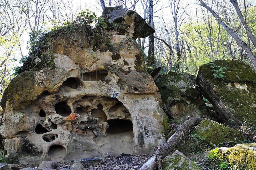 В глубине леса, среди огромных глыб вы обнаружите древний камень-мегалит. Говорят, это и есть священные камни исчезнувшего народа убыхов. Где-то на склонах горы, под завалами находится тайный грот их крылатой богини. А рядом с камнем, на вершине гром-скалы вы увидите, как корнями сплелись в одно целое столетний дуб и вековая липа, олицетворяя мужское и женское начало.