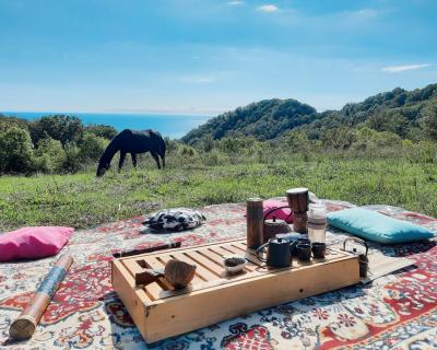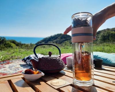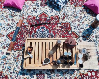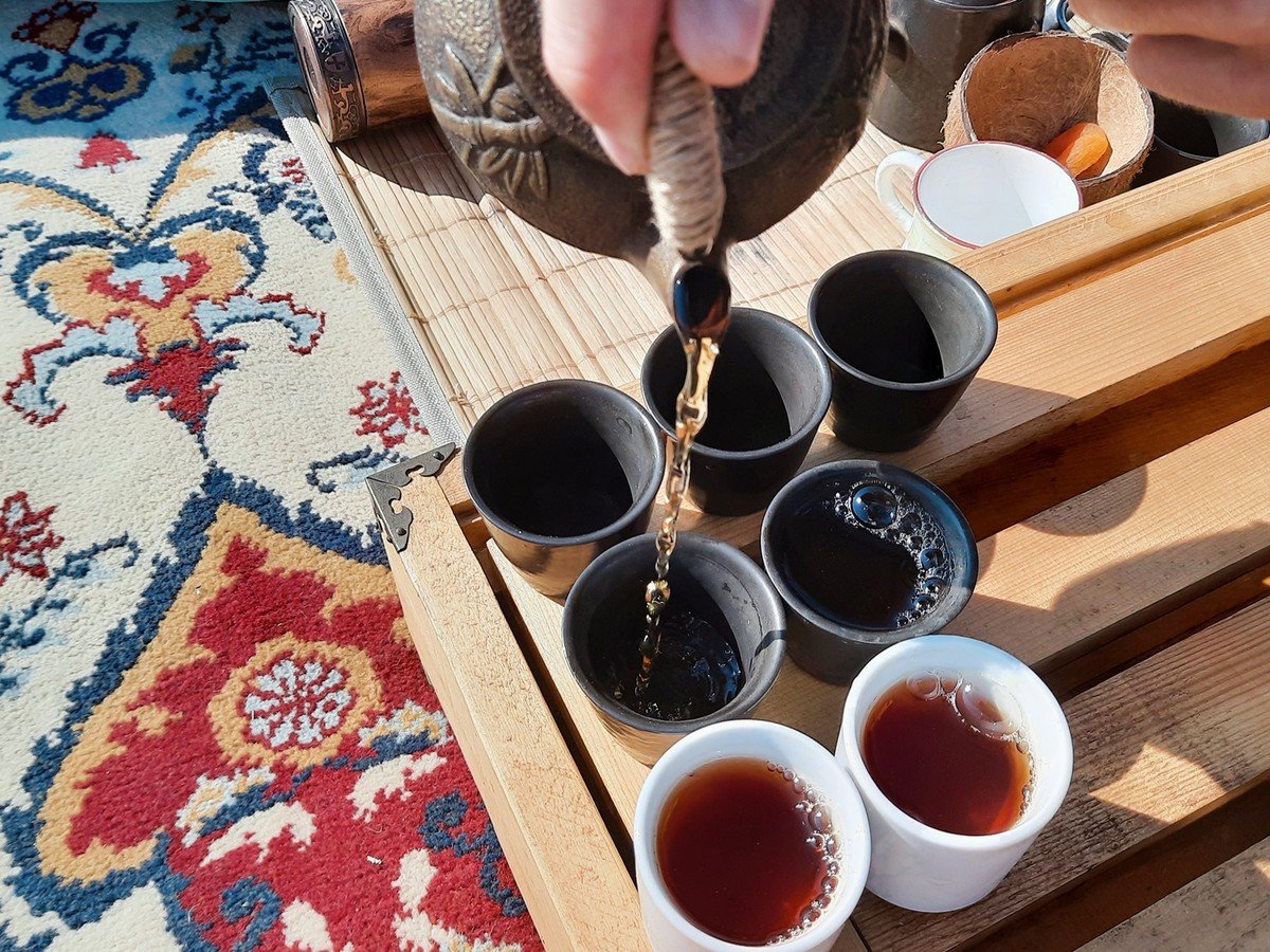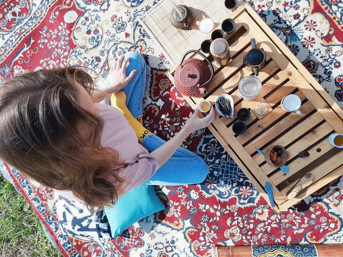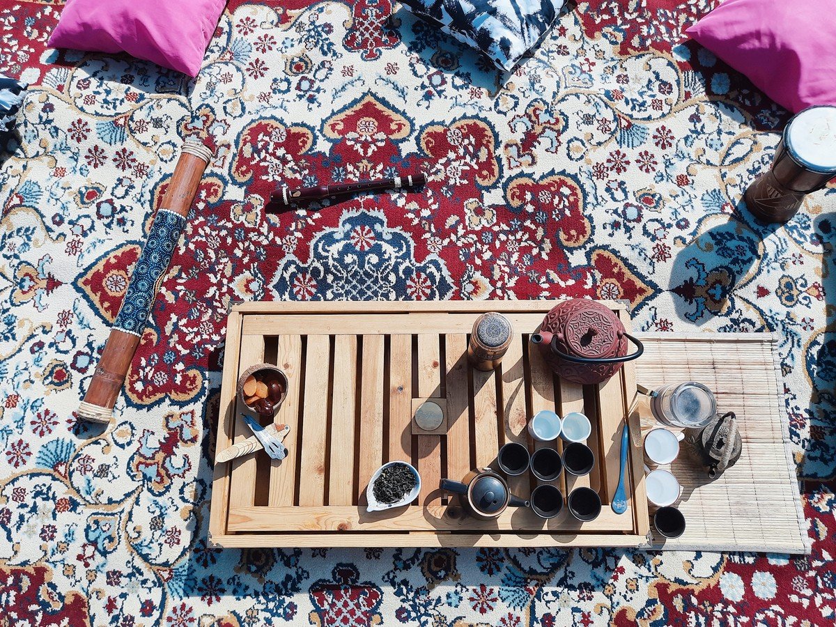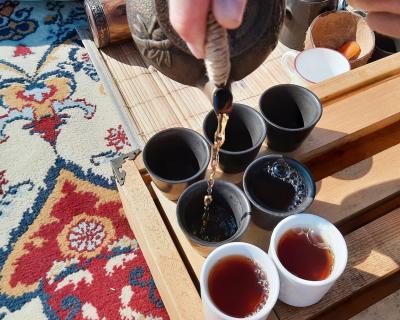 Для чайной церемонии мы оборудуем в окружении гор уютное местечко с тематической музыкой, тёплыми пледами и подушками. Здесь мы прекрасно проведём время за кружечкой китайского чая и приятной дружеской беседой. Также мы захватим с собой музыкальные инструменты, на которых каждый сможет поиграть при желании.