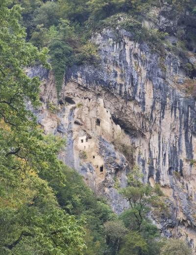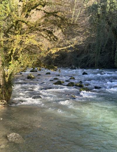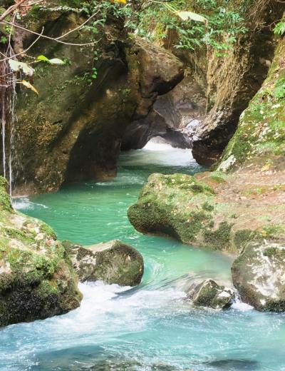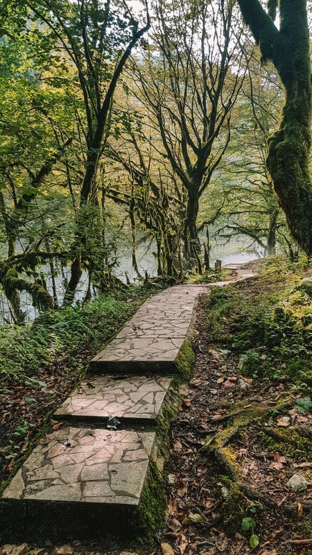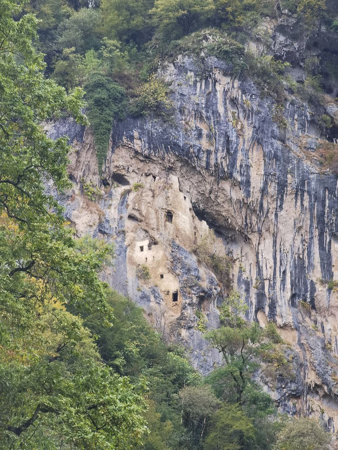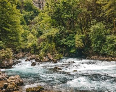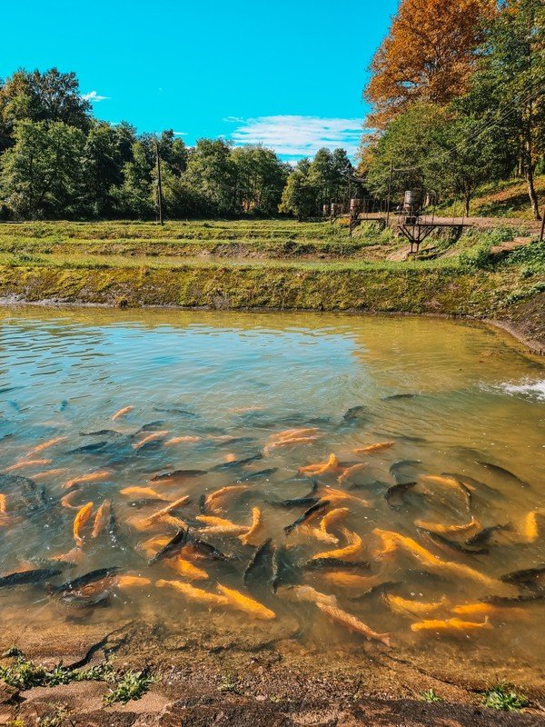 - Совсем другая природа нас встретит на форелевом хозяйстве — лазурная река Мчишта, замшелый лес, остатки древнего наскального монастыря. При желании можно поймать рыбу сачком, и её приготовят для вас
