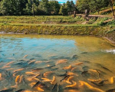 - Посещение форелевого хозяйства — 250 ₽ с чел. Если решите поймать рыбу сачком, то доплата — 1500 ₽/кг за приготовление.