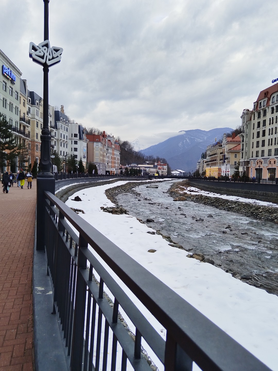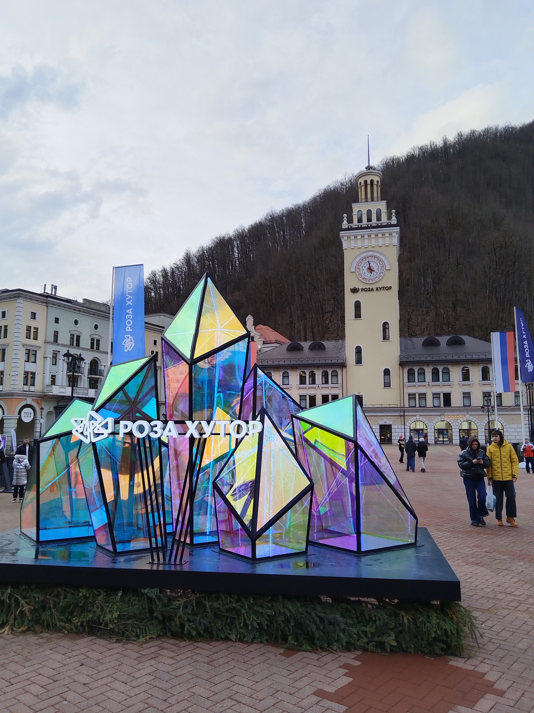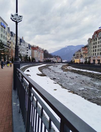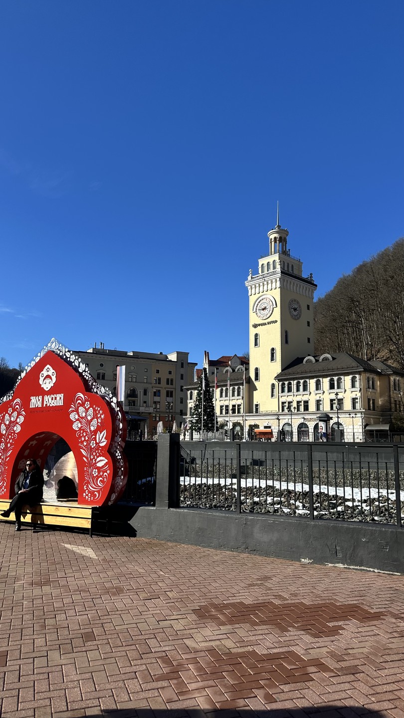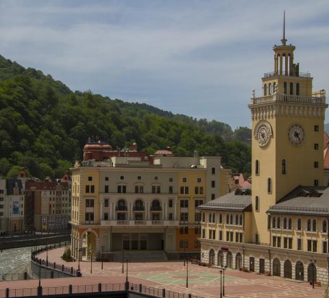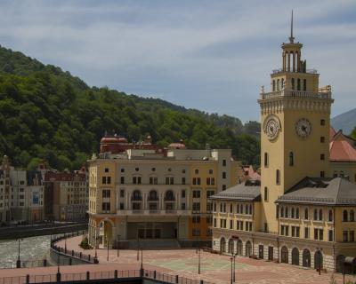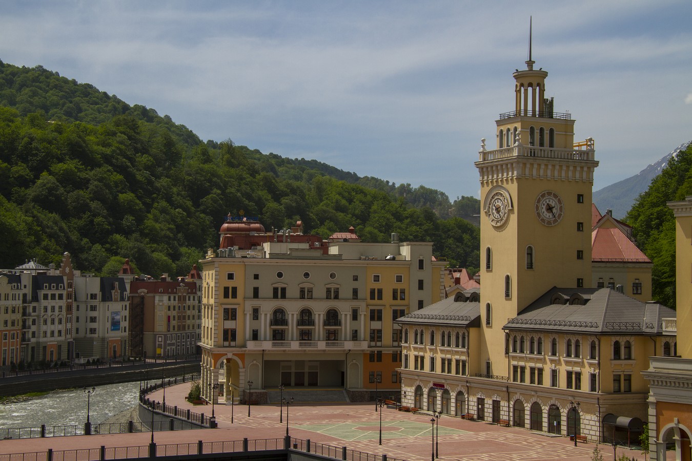 Дальше вас ждет променад по нижней части курорта «Роза Хутор». Знаменитая башня с часами, уютные здания на набережной реки — у вас сложится ощущение, что мы попали на улочки Старой Европы. Зимой здесь много горнолыжников в ярких костюмах, а летом туристов с массивными рюкзаками.