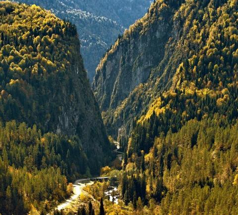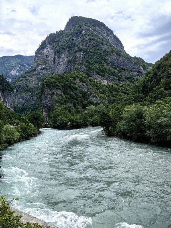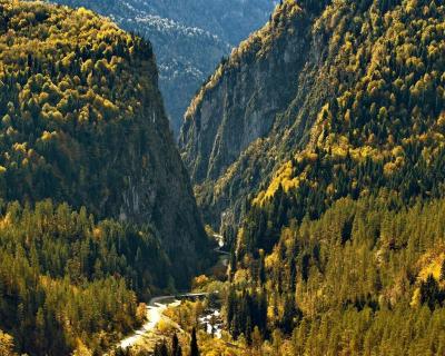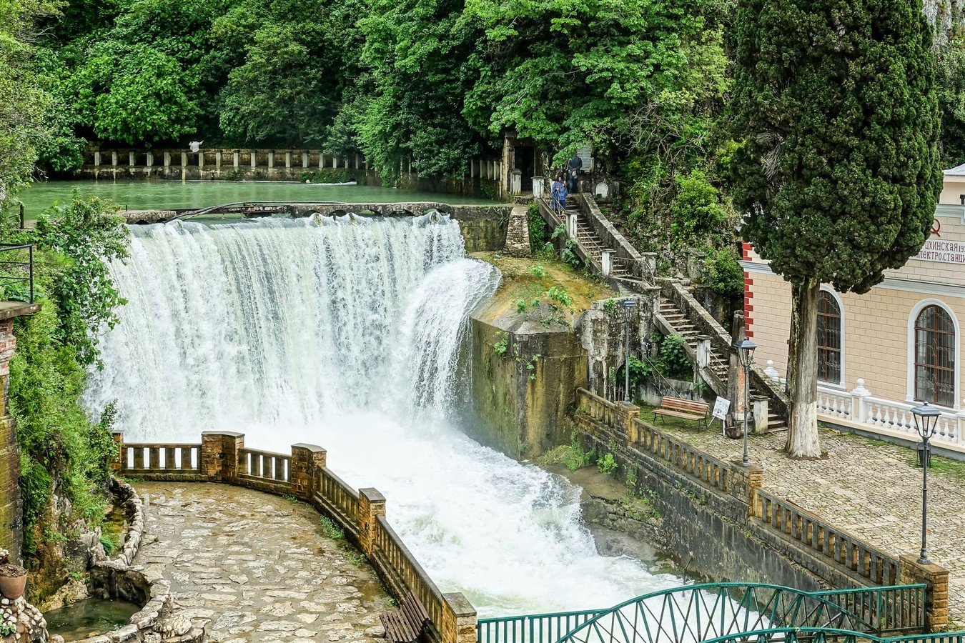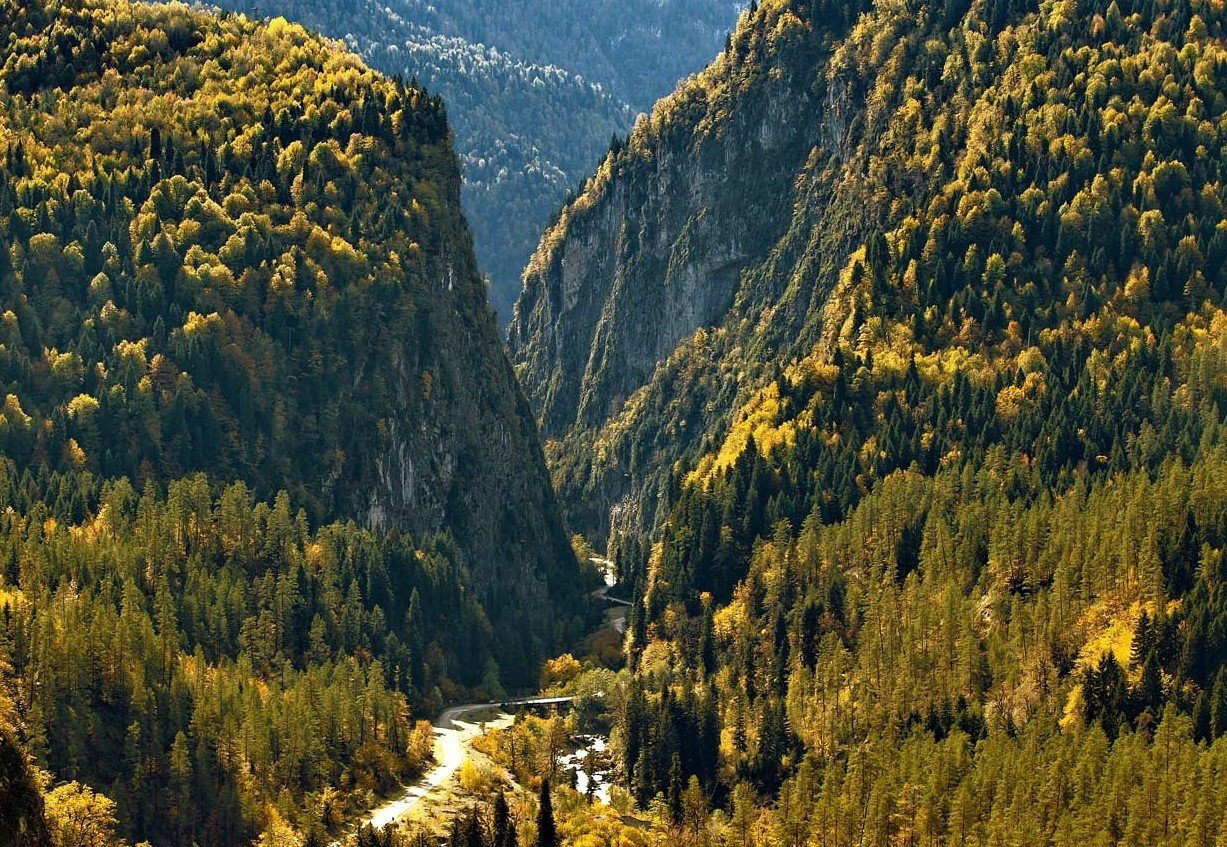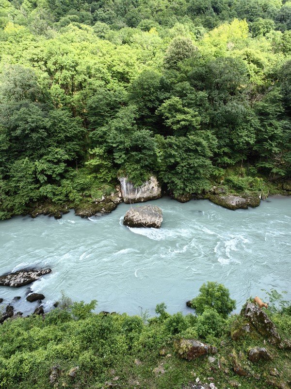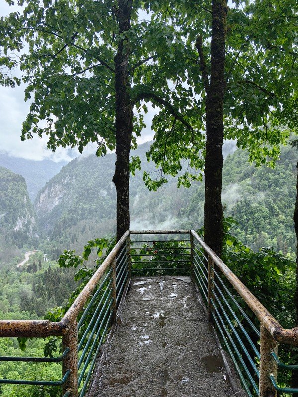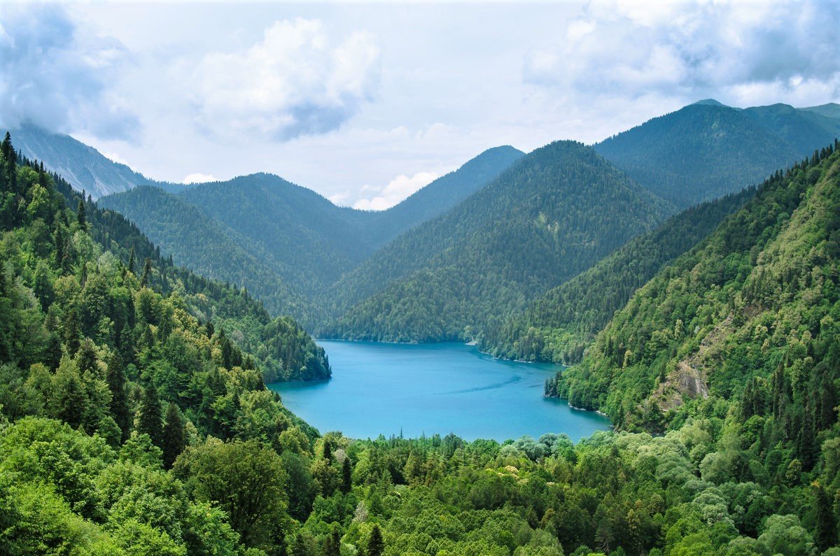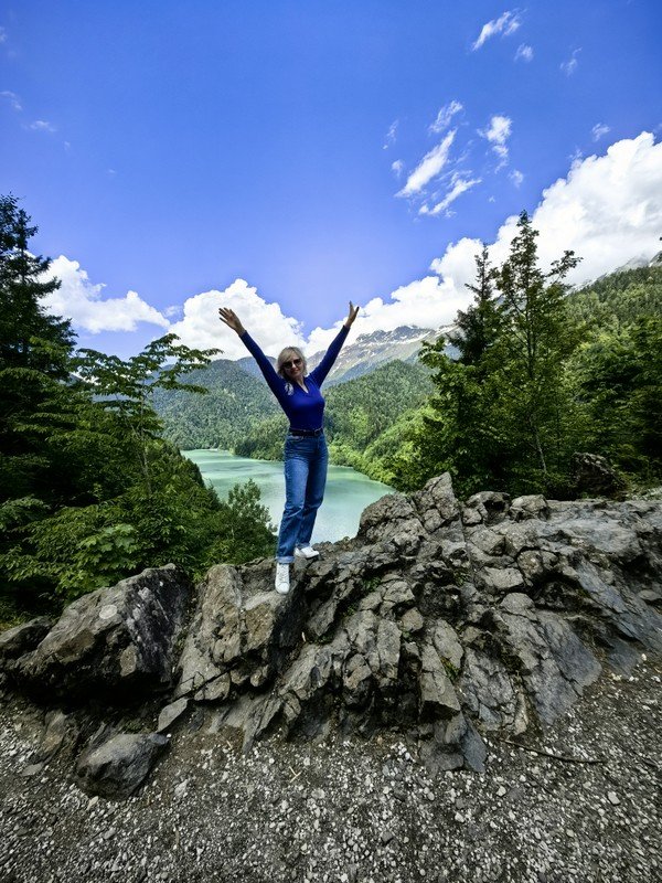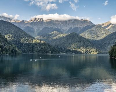 - Озеро Рица, чьи бирюзовые воды охраняют горы. Это место притягивает всех путешественников, но и дорога к нему сказочная: горные реки, мшистые камни и деревья в Бзыбском ущелье, романтичные водопады Девичьи и Мужские Слёзы, смотровая площадка под названием «Прощай, Родина» и яркое Голубое озеро.