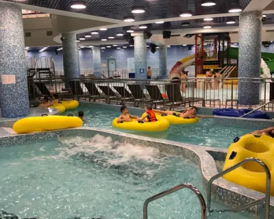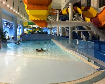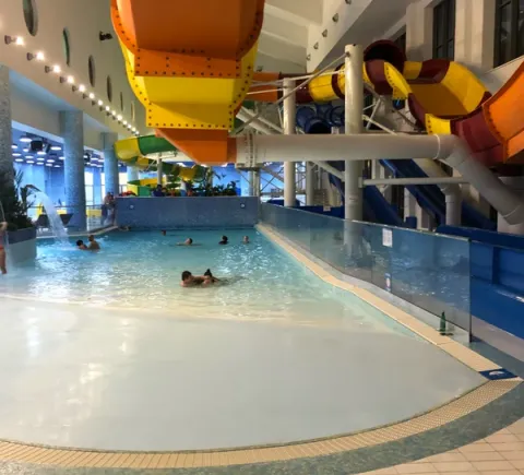 А потом — курорт «Газпром». У вас будет 3 часа, чтобы отдохнуть в аквапарке «Галактика». Внутри — горки, волновые бассейны, водопады, ленивые реки, финская сауна и многое другое. Если не планировали ехать в аквапарк, можете просто погулять — у нас есть специальный билет без посещения аквапарка.