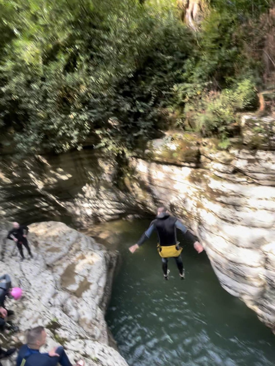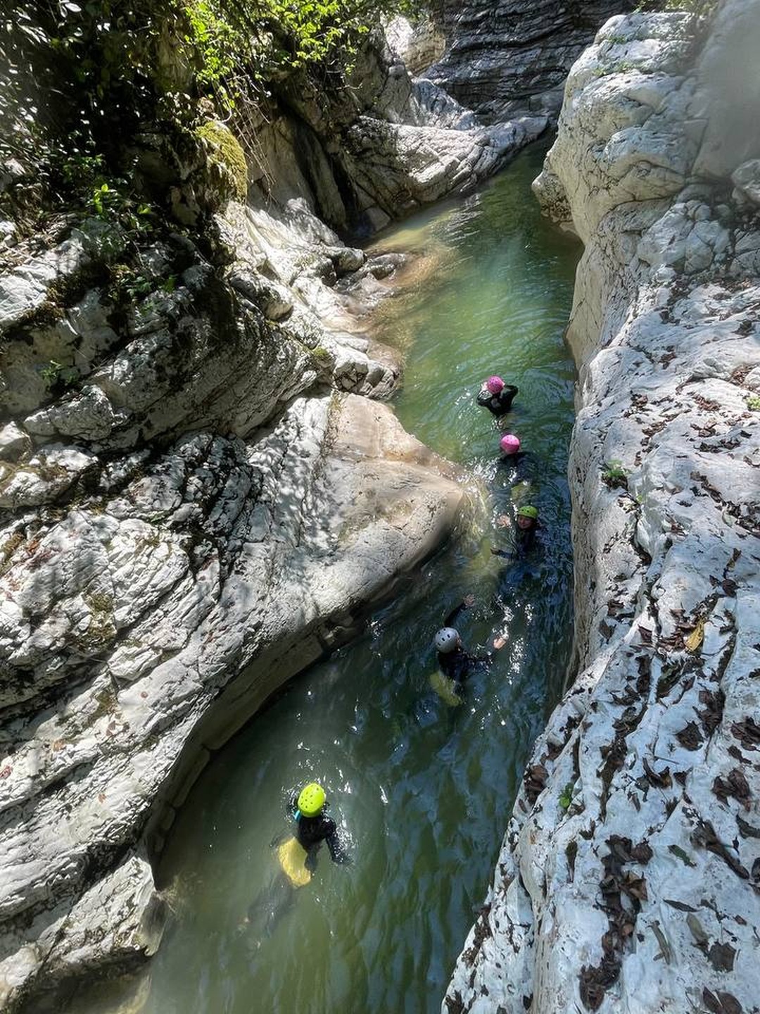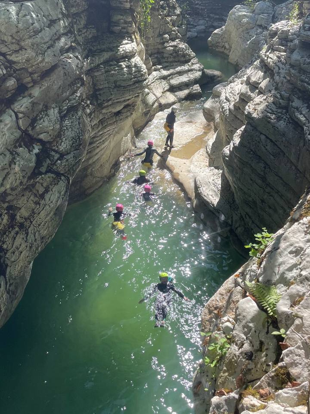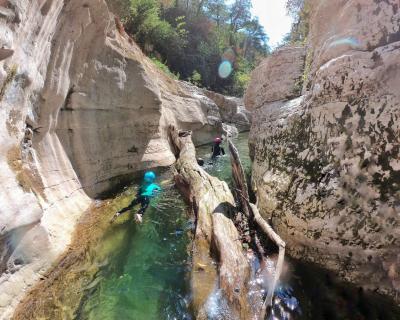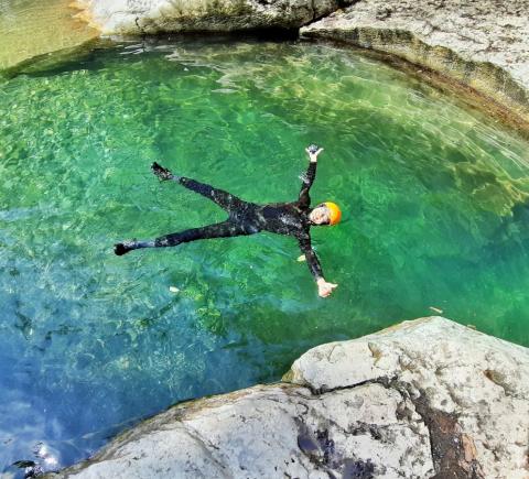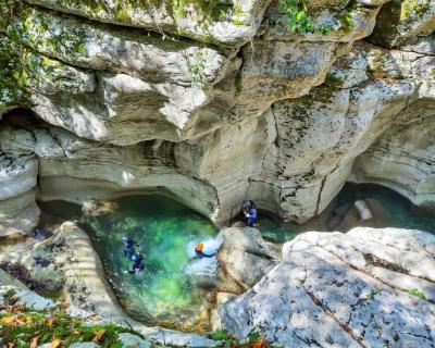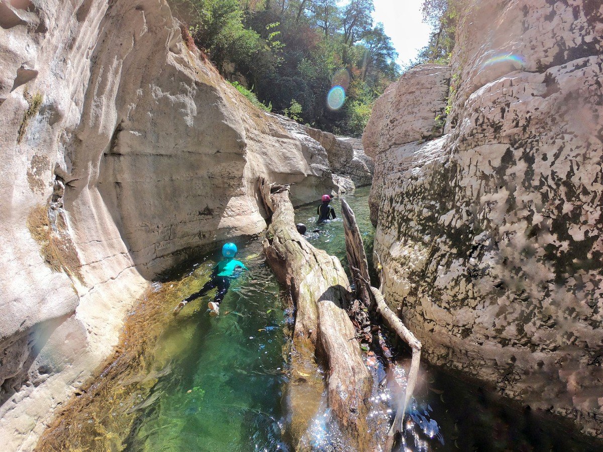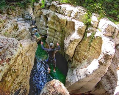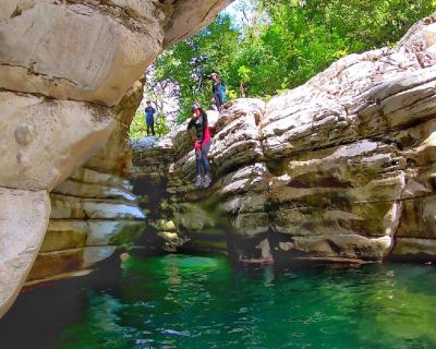 - Прыжок в воду — и дальше вас ждёт самое интересное: пешком и вплавь мы пройдем каньон, попрыгаем и поныряем, а еще искупаемся в природном джакузи. Интерьеры этого природного бассейна потрясающие: фактурные скалы, поросшие зеленью, лабиринты каньона, густая зелень над бирюзовой водой.