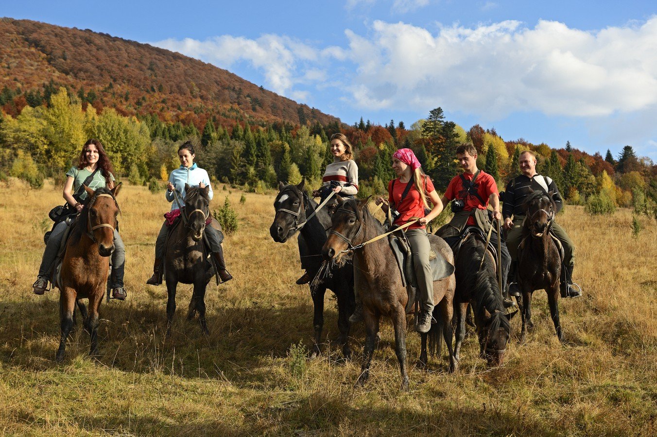 Мы организовываем прогулки как для заядлых любителей верховой езды, так и для новичков. Вы можете взять с собой детей: ребенок будет сидеть с родителем на одной лошади или, по желанию и возможностям, отдельно — в этом случае дети, а также взрослые без опыта верховой езды поедут в связке. Наши кони привыкли ходить в колонне. Также у них есть надёжный друг, который легко и безопасно управляется с ними. Нашу группу будет возглавлять всегда он.