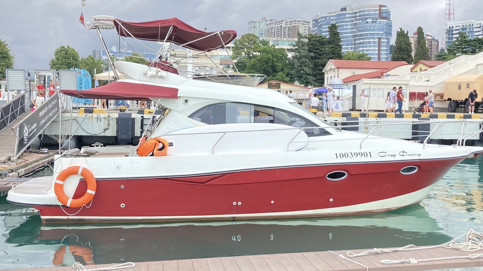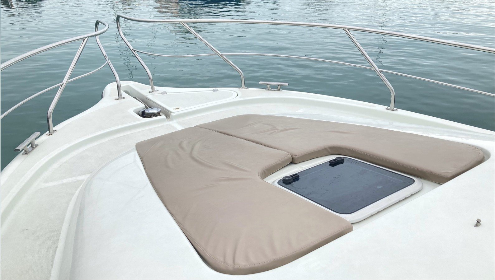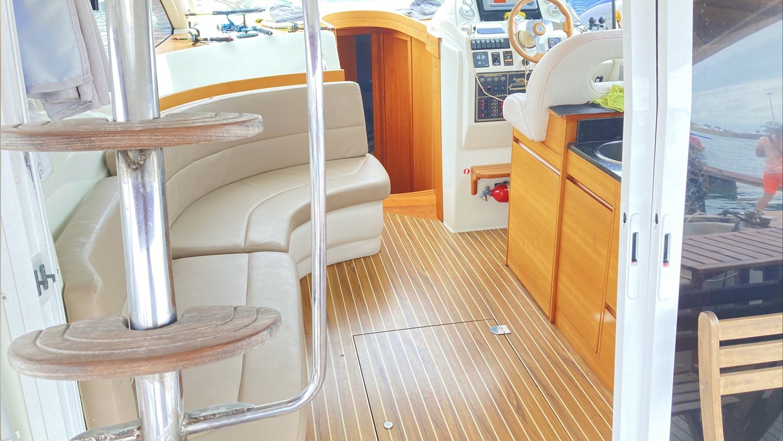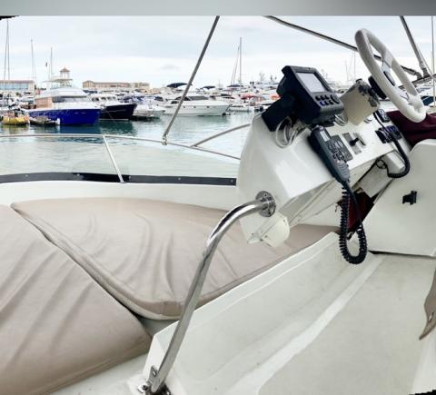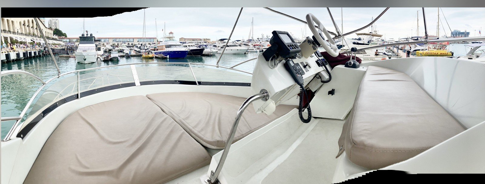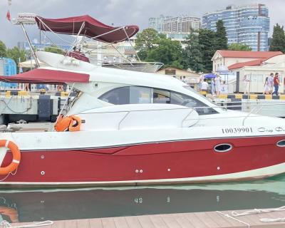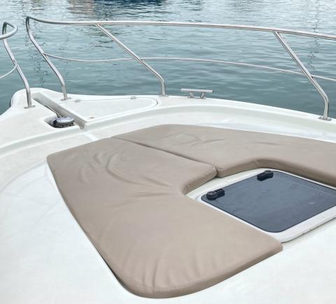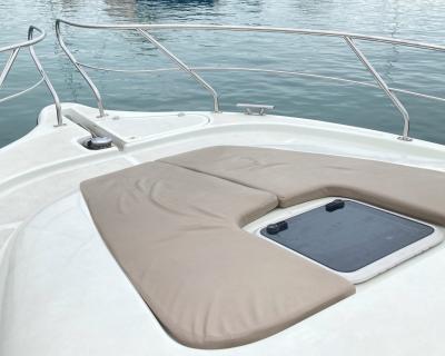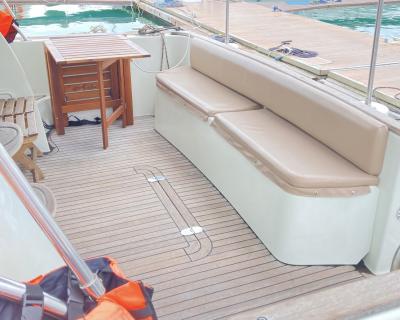 Перед вами двухпалубная испанская яхта с флайбриджем. В чём её преимущество? Благодаря открытой верхней палубе свободного места на борту становится существенно больше. Такие суда выбирают те, кто не гонится за скоростными рекордами и предпочитает провести время с максимальным комфортом.