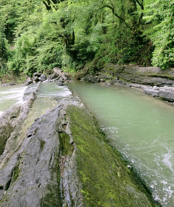Горная река перетекает из одного природного бассейна в другой. А вокруг — необычной формы скалы, покрытые мхом и редкими вечнозелёными растениями.