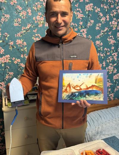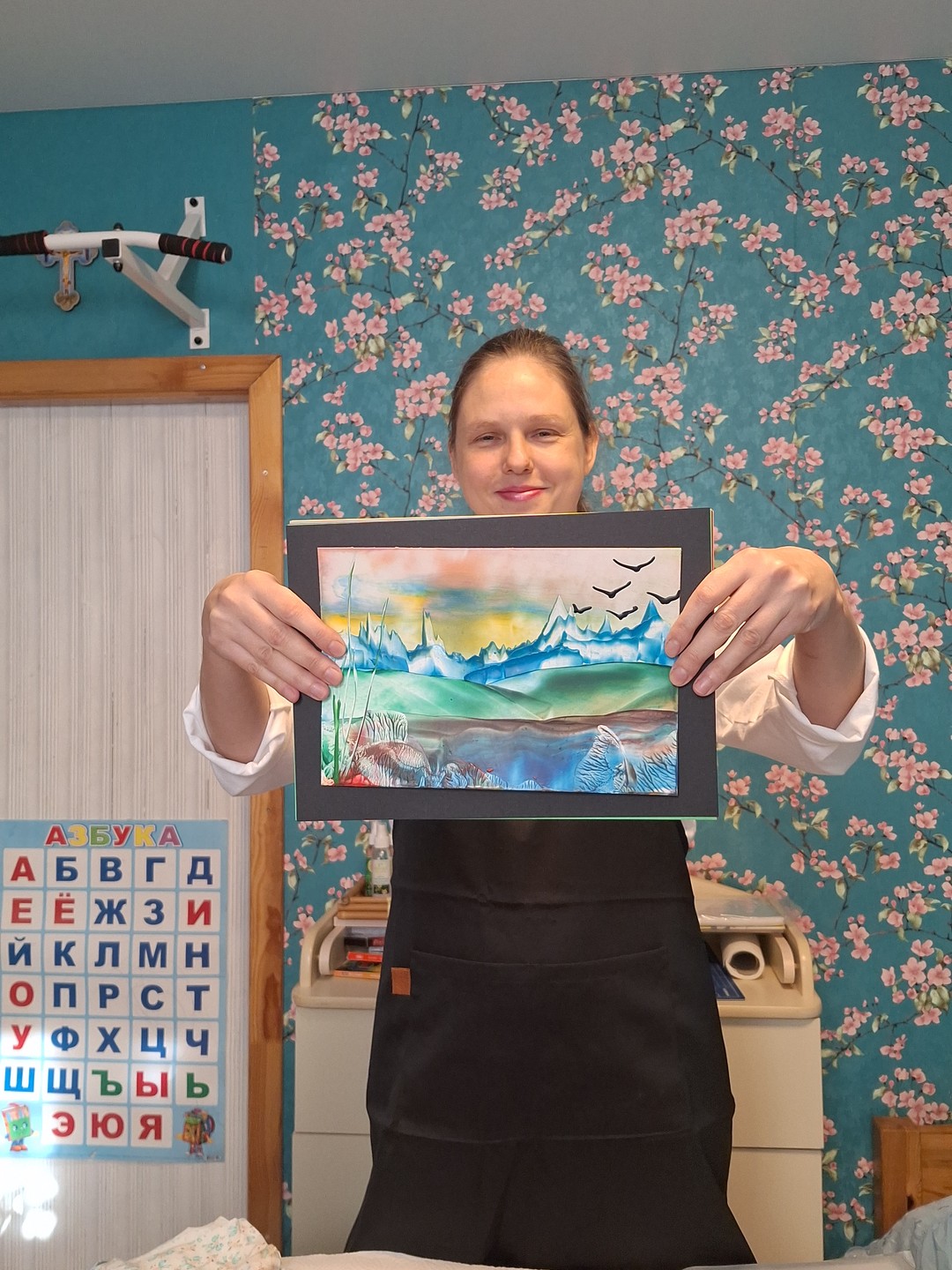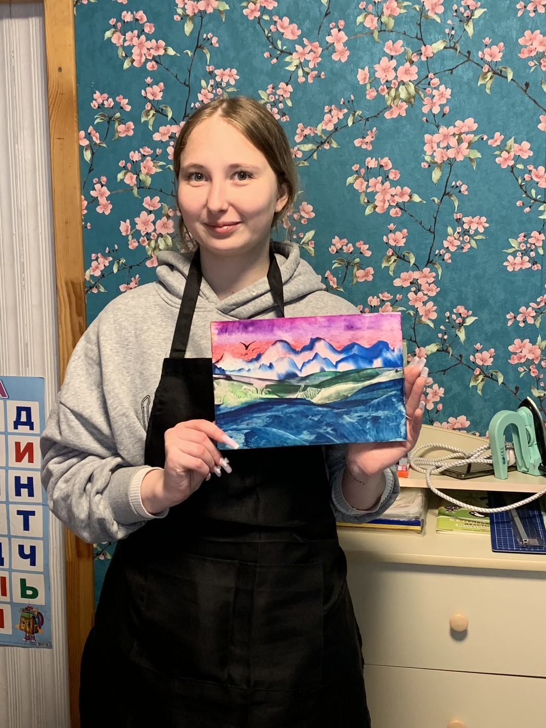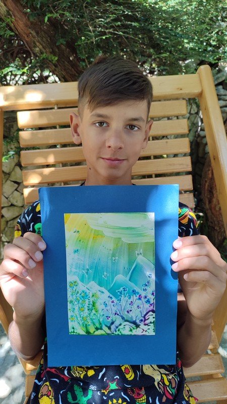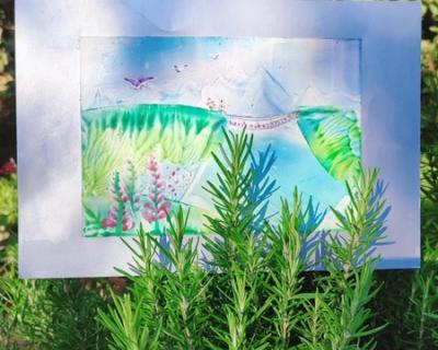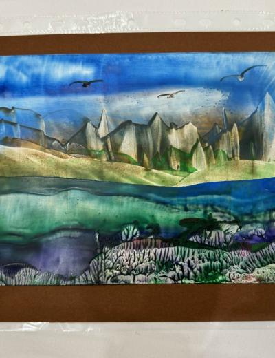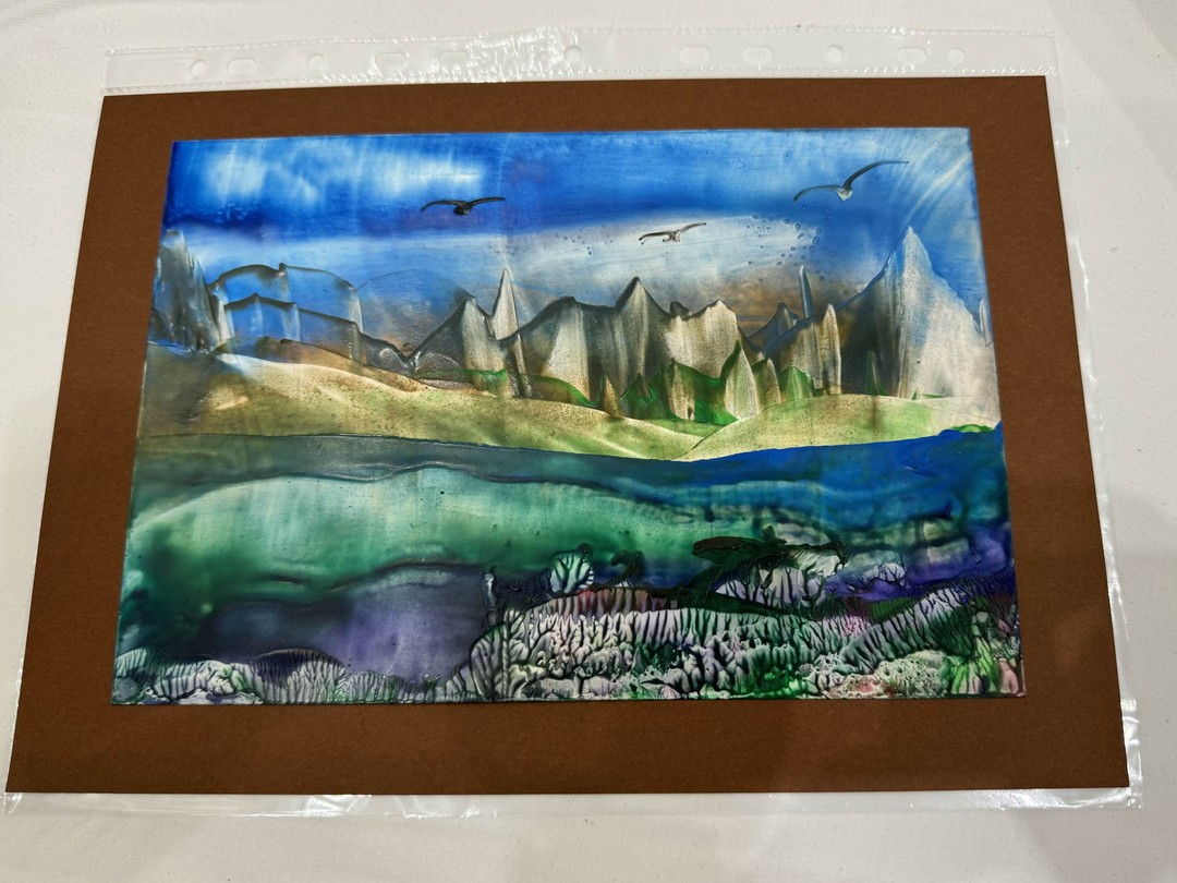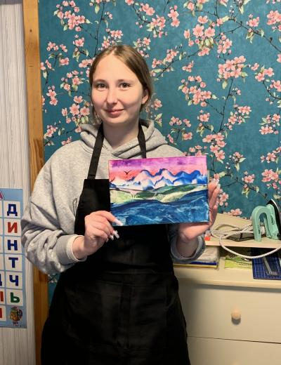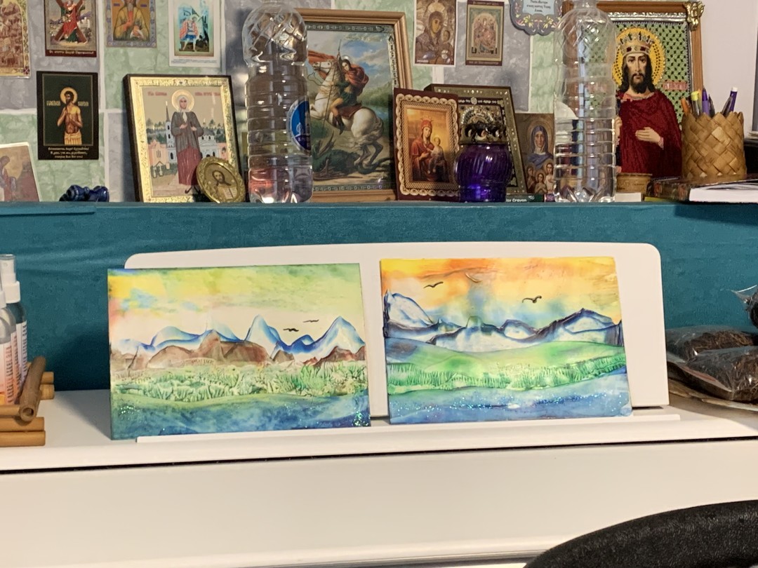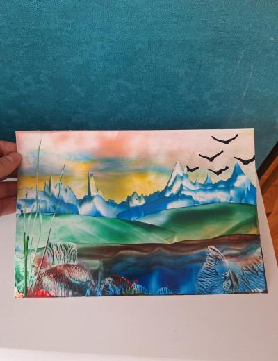- Вы освоите разнообразные приёмы написания картин утюгами и научитесь рисовать небо, горы, растительность, водоёмы, парящих птиц. В результате у вас получится многоплановый пейзаж. По желанию картину можно украсить блёстками. Формат готовой работы (вместе с рамкой) — А4