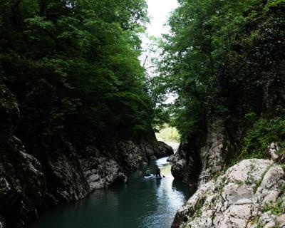 - Мы на месте! Проводим инструктаж и спускаемся на воду. Вас ждут 2 часа среди удивительных скал каньона реки Хоста. Этого времени хватит, чтобы проникнуться красотой вокруг и запечатлеть её — и себя — на фото.