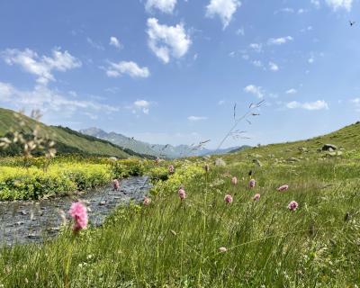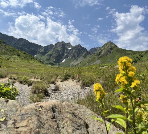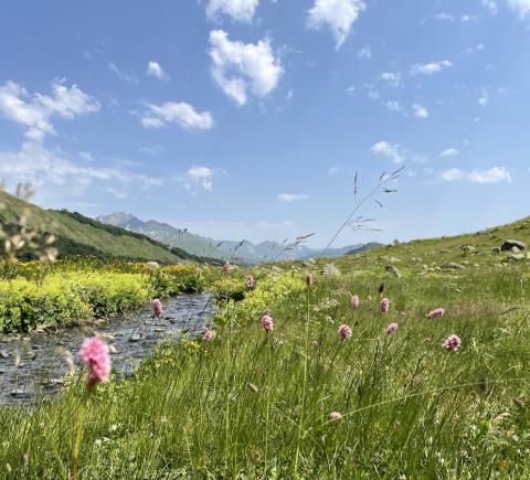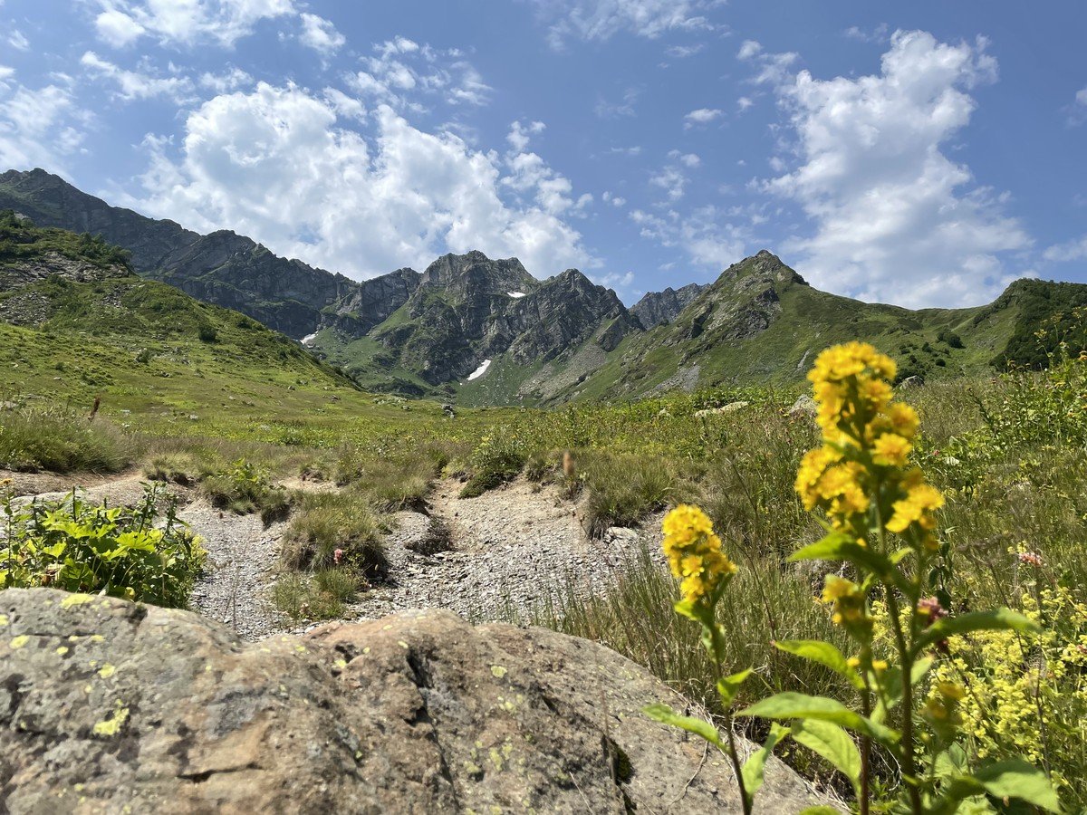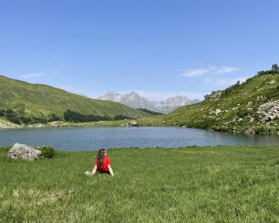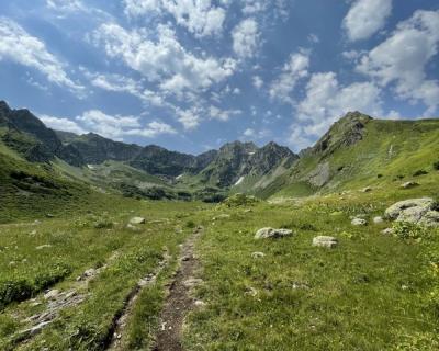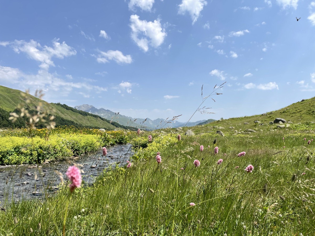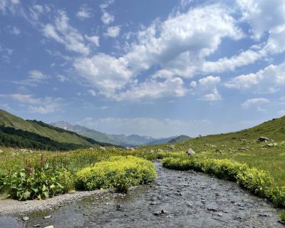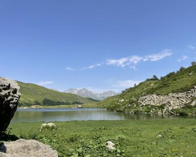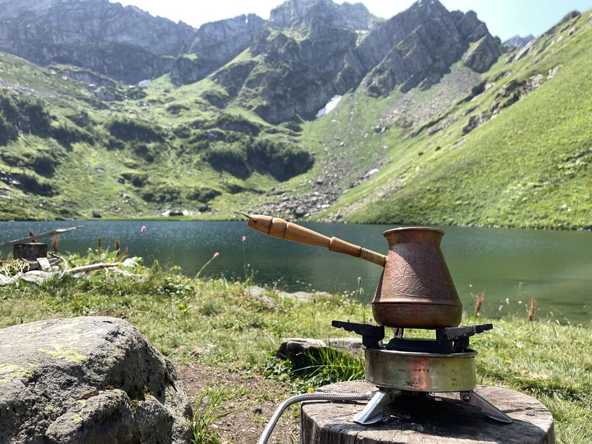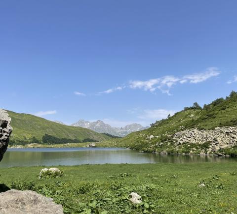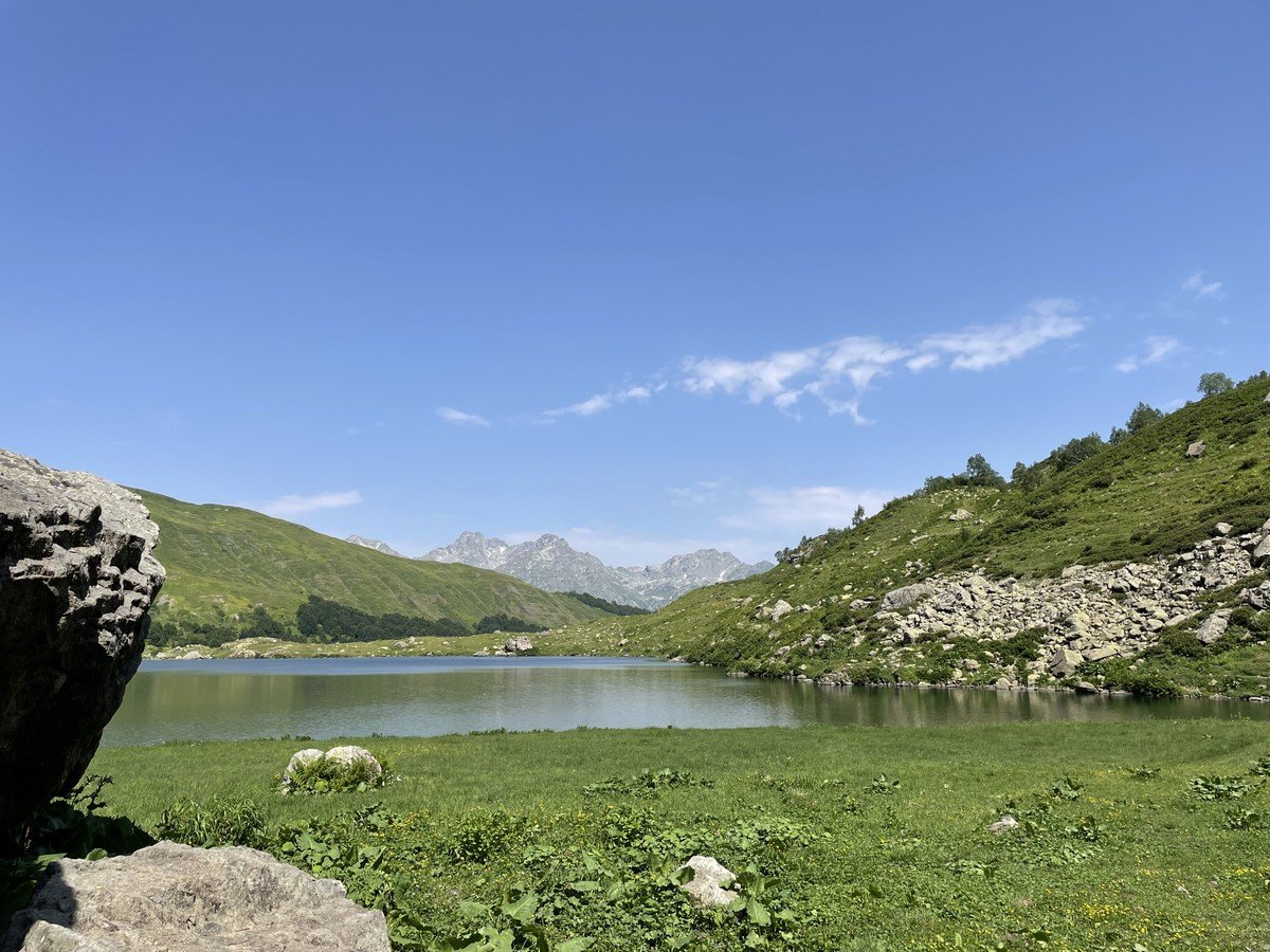 Вот и оно — на высоте 2000 м над уровнем моря лежит горное озеро Мзы. В прозрачной воде отражаются горные вершины. А снег, который никогда не тает полностью, белыми шапками поблескивает на зеленой траве. Вдоволь полюбуемся водоёмом и устроим небольшой привал: будем пить чай с пирогом и делиться впечатлениями.