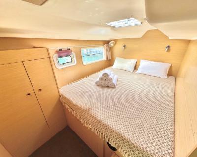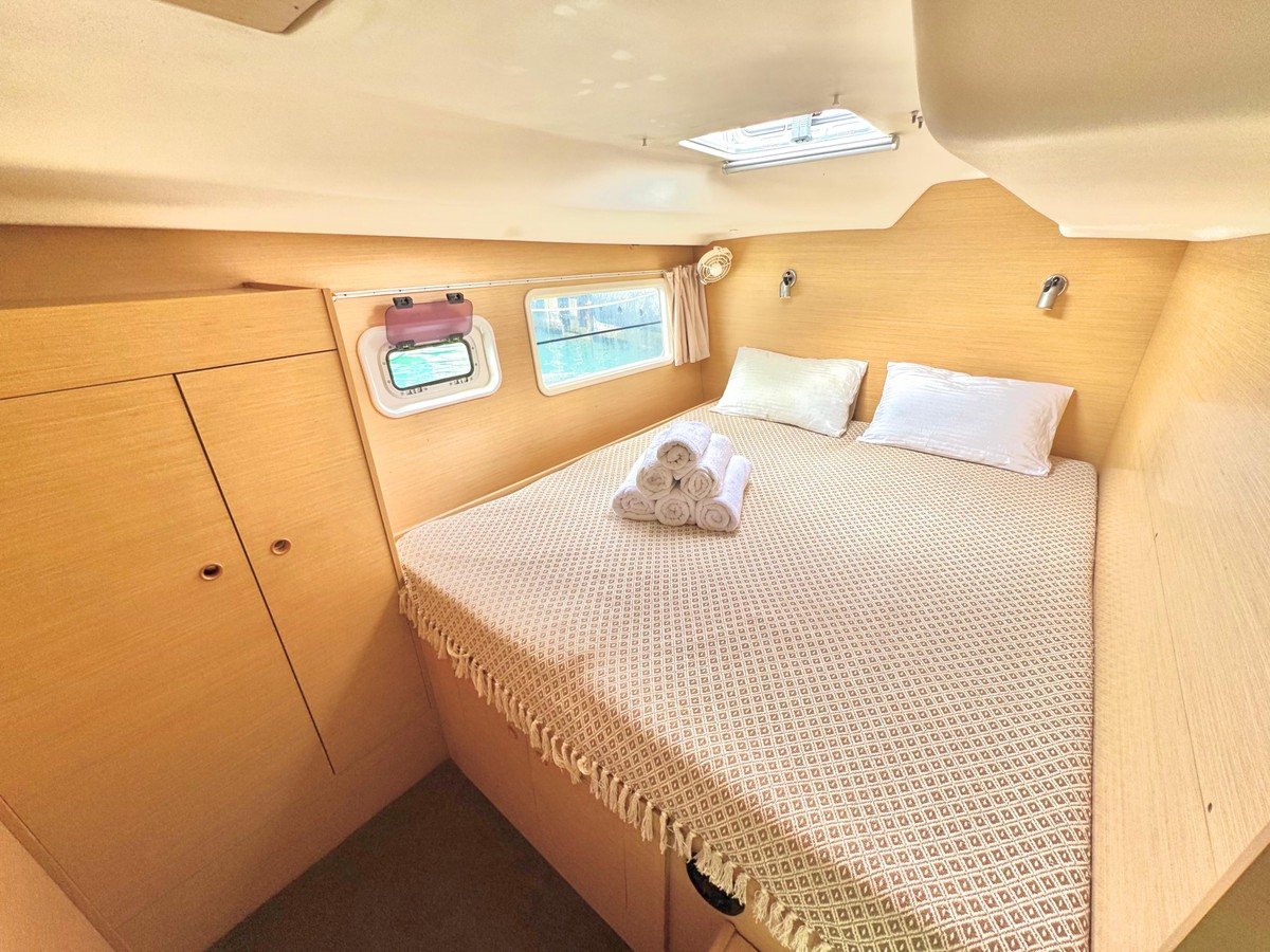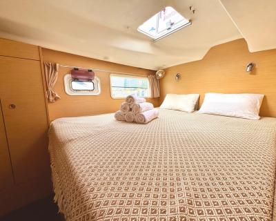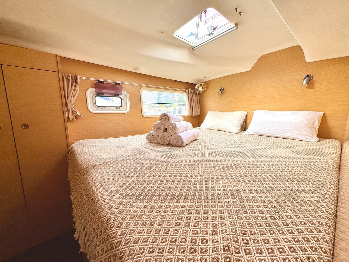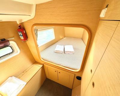 Катамаран оснащён всем необходимым для комфортного пребывания. Просторный салон с комфортабельными мебелью и панорамными окнами предлагает потрясающий вид на окружающий ландшафт. Каюты снабжены удобными кроватями и просторными шкафами для хранения личных вещей, а санузлы — современными сантехническими приборами.