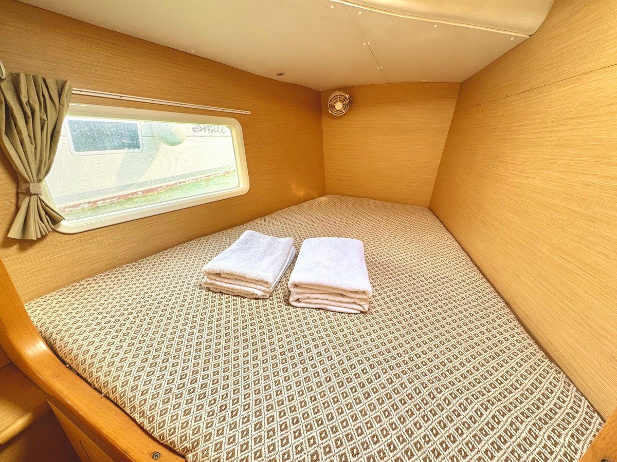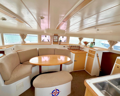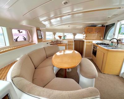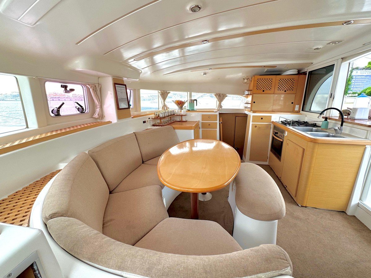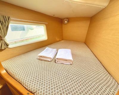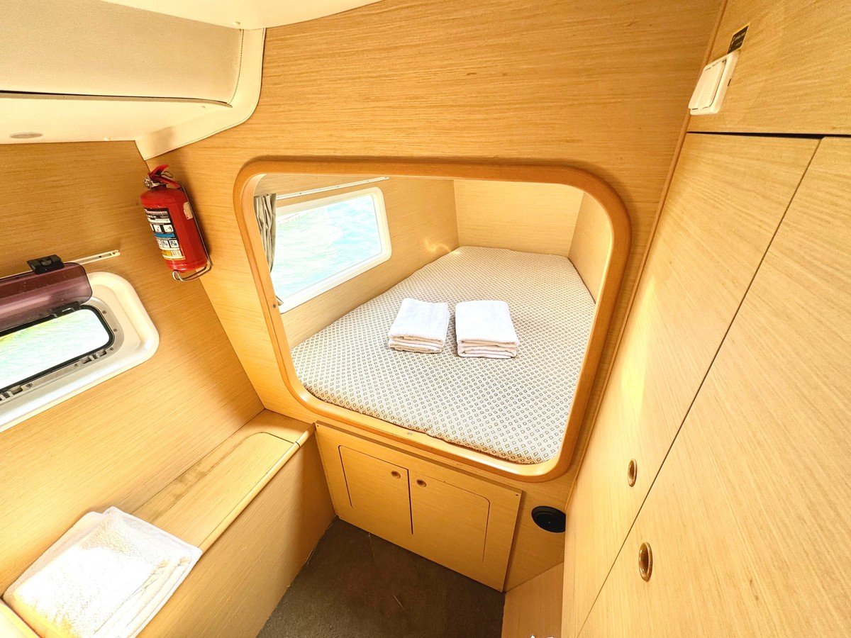 Катамаран оснащён всем необходимым для комфортного пребывания. Просторный салон с комфортабельными мебелью и панорамными окнами предлагает потрясающий вид на окружающий ландшафт. Каюты снабжены удобными кроватями и просторными шкафами для хранения личных вещей, а санузлы — современными сантехническими приборами.