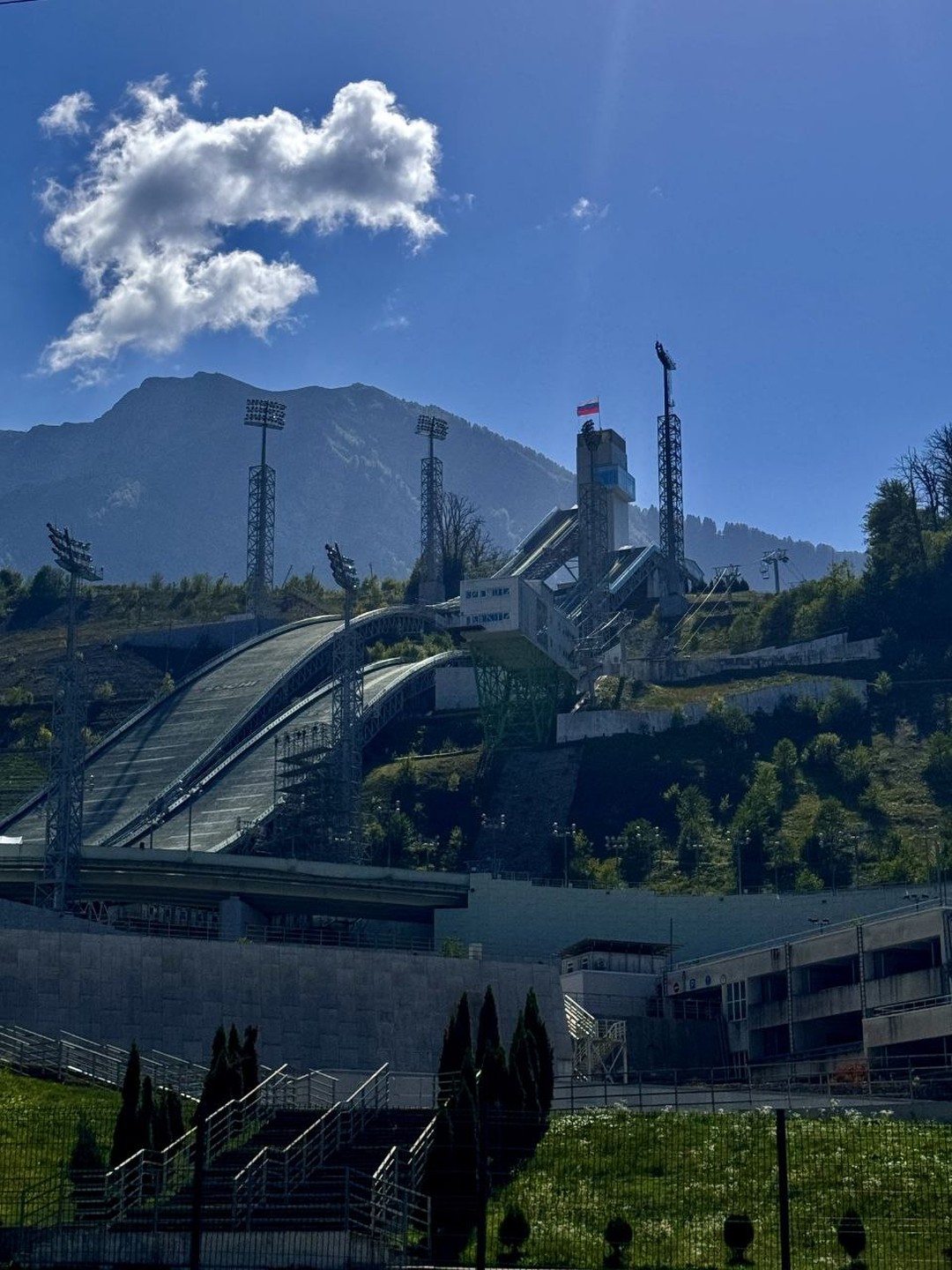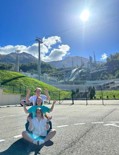 Вы побываете на обзорной площадке у «Русских горок» — комплекса трамплинов, где во время Зимних Олимпийских игр проходили соревнования по прыжкам, а также лыжное двоеборье. Змеистый серпантин приведёт вас к грандиозному горному кластеру, окруженному горами Аибга, Чугуш и Ачишхо.