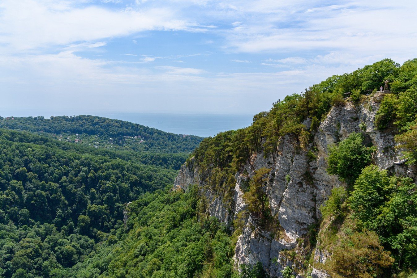 Дальше — самый сложный участок пути, но не переживайте, справятся все! Наградой станет фото с Прометеем с самой высокой точки Орлиных скал (383 м). А со смотровой площадки вам откроется панорама Агурского ущелья.