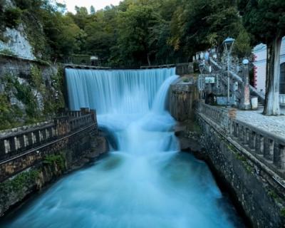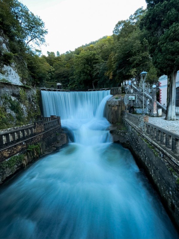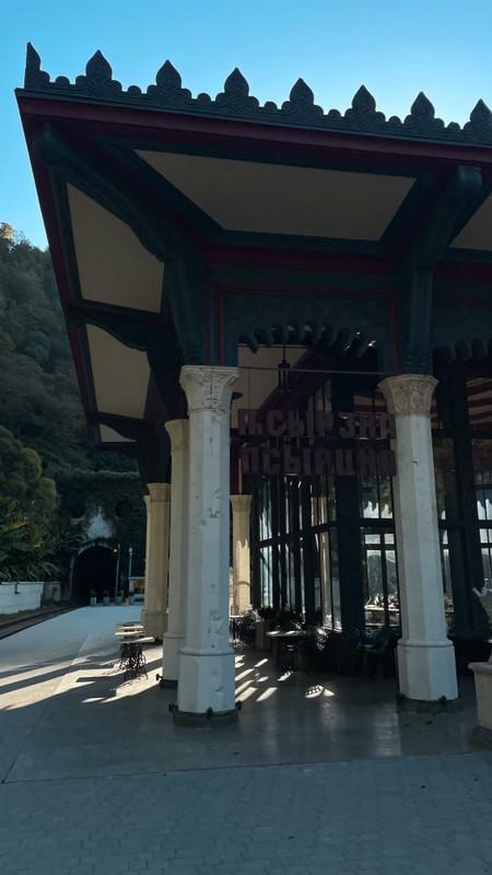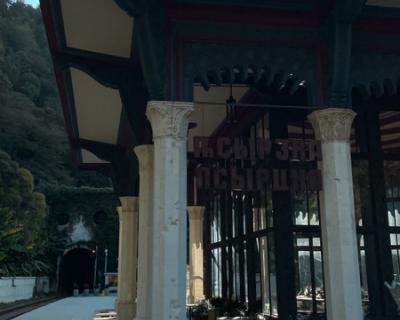 - Новый Афон. Погуляем по уютному поселению и зайдём на ж/д станцию Псырцха на берегу водохранилища. Вы увидите два обрамляющих её платформу туннеля, стилизованные фонари, павильон с сохранившейся лепниной, колоннами и своды с орнаментом. Пройдёмся по набережной озера водохранилища и увидим Новоафонский водопад.