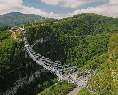 🌁 Приготовьтесь к головокружительной прогулке по самому длинному подвесному мосту в России, который соединяет два живописных склона Ахштырского ущелья. Попутно вы остановитесь на смотровых площадках Скайбриджа и увидите места, с которых прыгают экстремалы. А если вы придёте сюда в вечернее время, встретите незабываемый закат на высоте 330 метров.