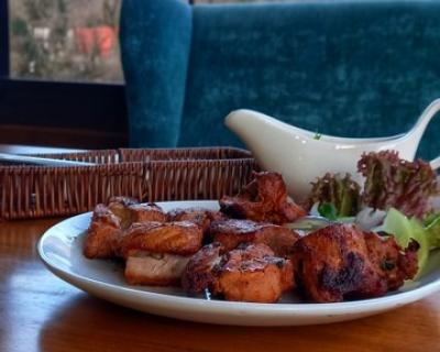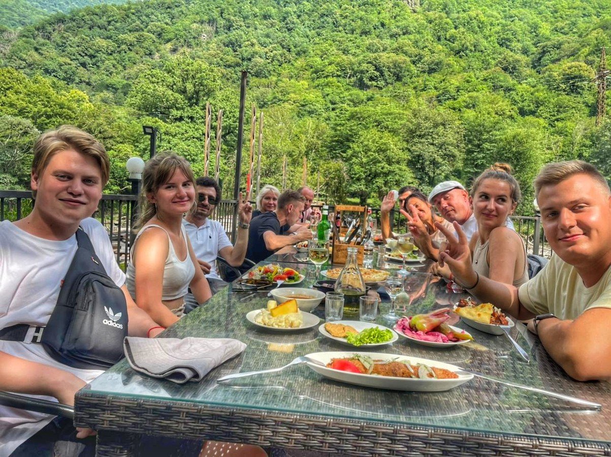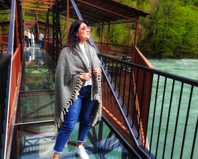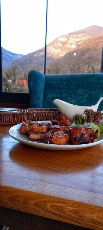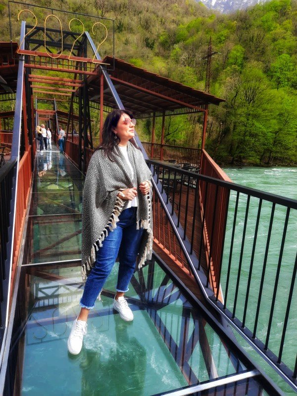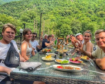- Пообедать остановимся в ресторане на берегу реки Бзыбь, где помимо вкуснейшей кухни вас ждут яркие фотолокации, в том числе единственный в Абхазии стеклянный мост