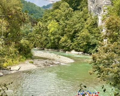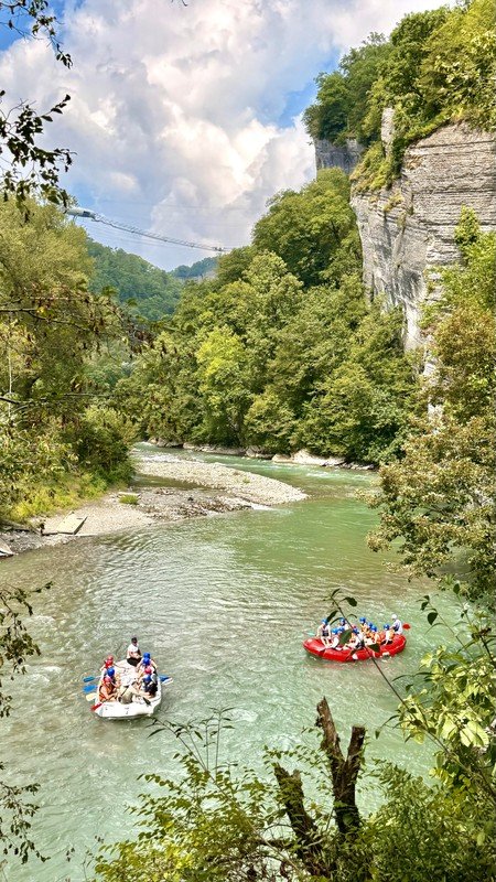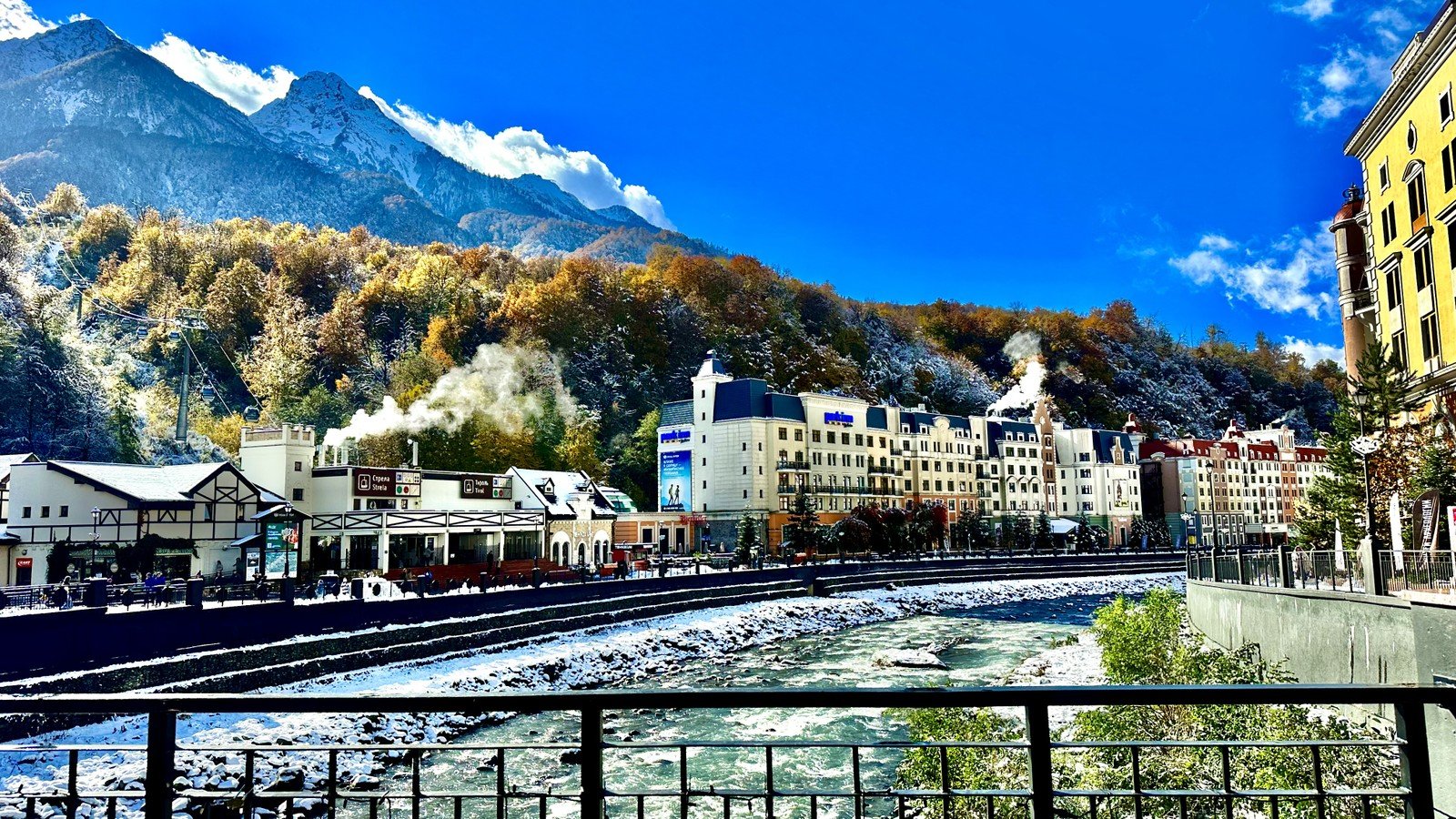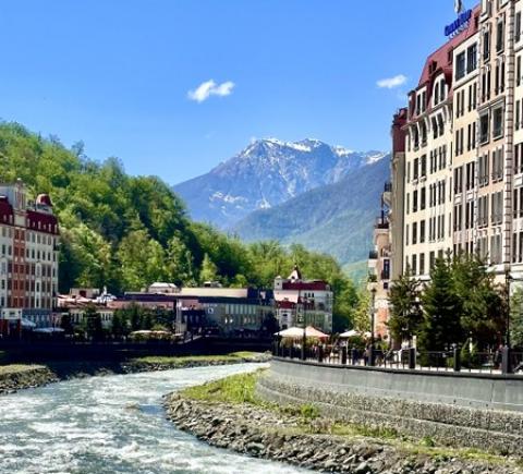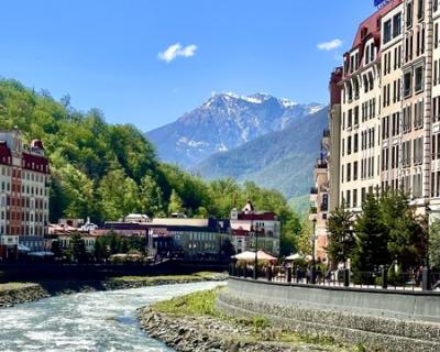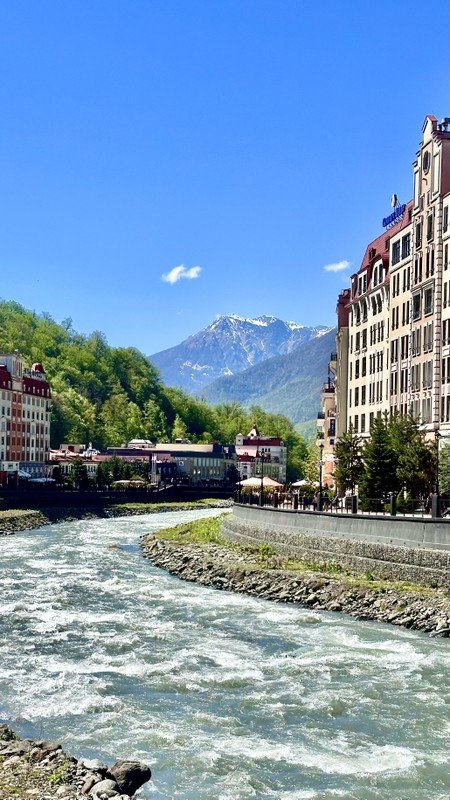 Прогулка по набережной реки Мзымта. Альпийские фасады, уютные улицы, атмосфера европейского курорта — и при этом всё окружено кавказскими вершинами.