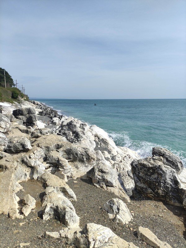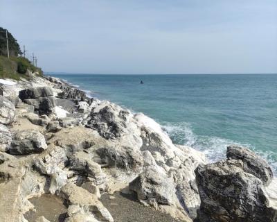 Пляж Белые скалы. Одна из самых интересных локаций Абхазии. У кромки моря здесь разместились ярко-белые причудливые скалы. Если включить фантазию, в складках породы можно разглядеть образы подводных существ. Красочный сосновый бор на заднем фоне отлично дополняет пейзаж.